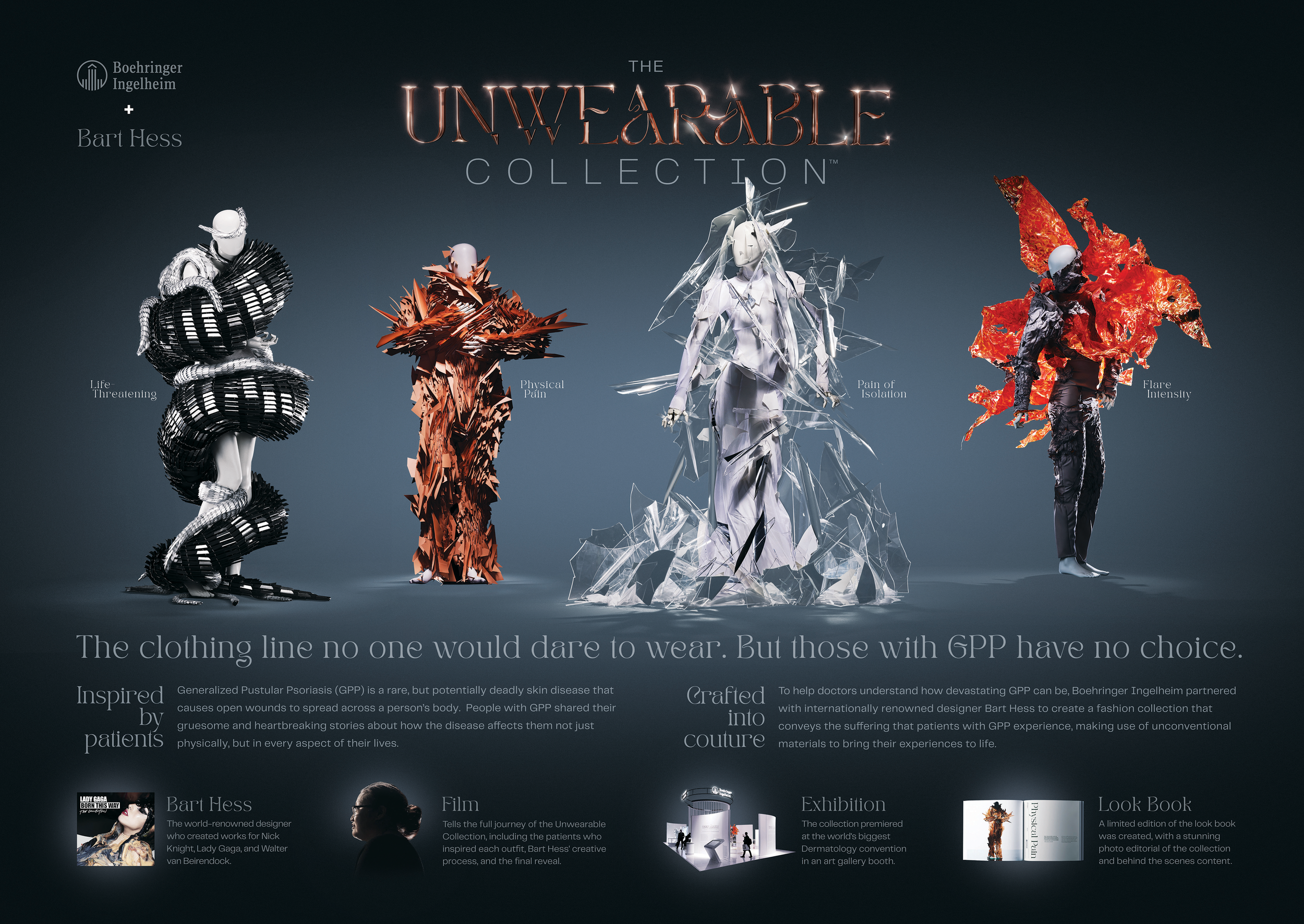 We created this integrated campaign for Boehringer Ingelheim to shed light on a rare disease that was, until then, unknown to most dermatologists worldwide. Together, we crafted the "Unwearable Collection" to highlight the painful realities faced by patients with generalized pustular psoriasis (GPP). Working closely with Dutch artist Bart Hess, renowned for his work with Lady Gaga, we designed a macabre clothing line that symbolized the immense suffering endured by those living with this rare skin disease. The eight-foot-tall mannequins, donning these emotionally charged and unconventional fashions, served as the centerpiece of this impactful campaign, aiming to challenge perceptions and evoke empathy for GPP patients.